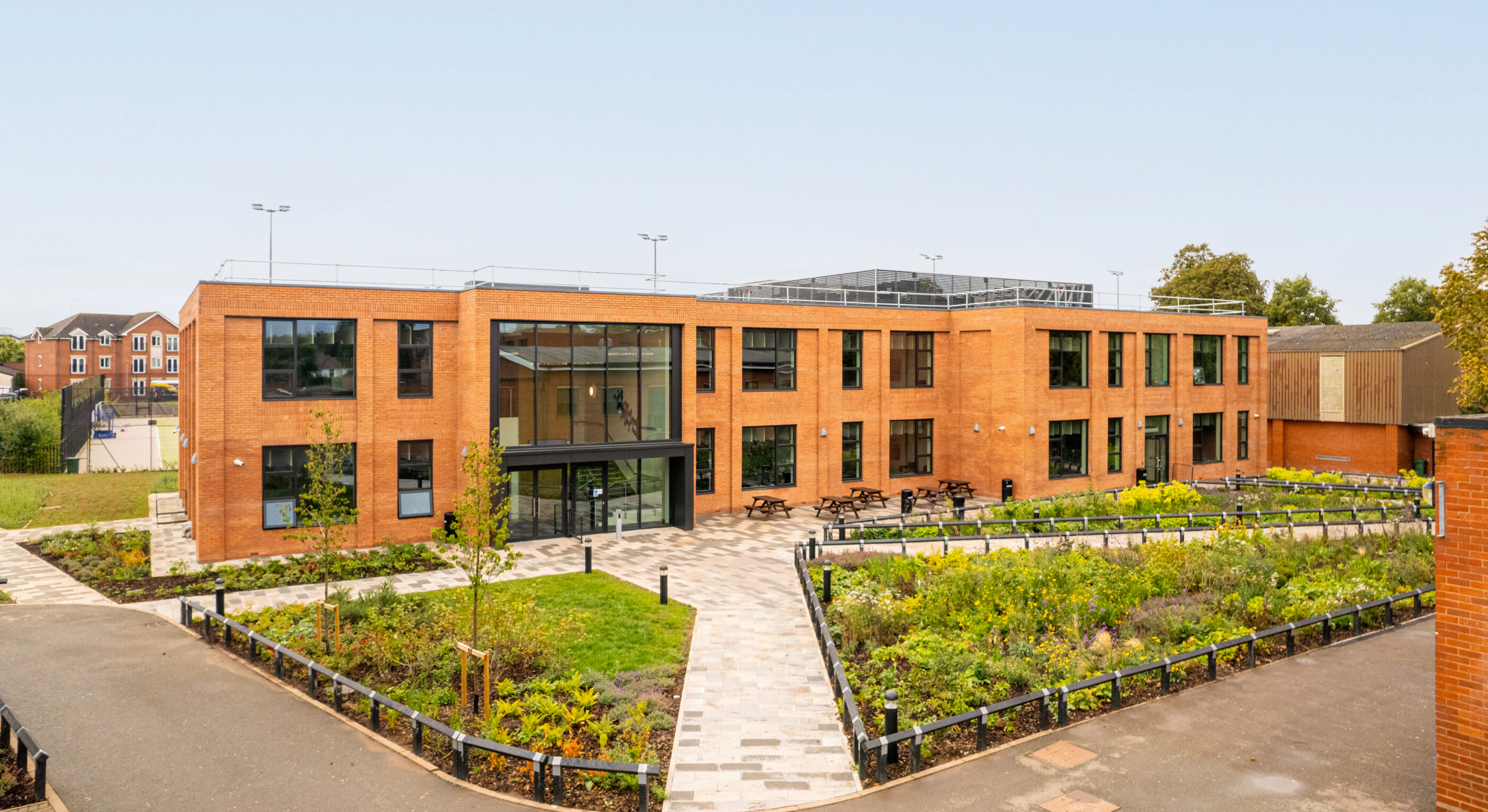 Sitting centrally within the school site, this posed challenges to access and the health and safety of staff, pupils and visitors. Our solution, after consulting with Warwickshire County Council Transport & Highways, has been to create an alternative access and egress point ensuring secure separation between construction activities and the school pupils and staff.